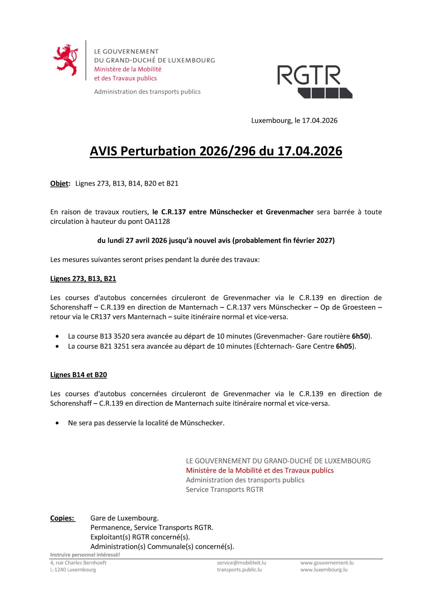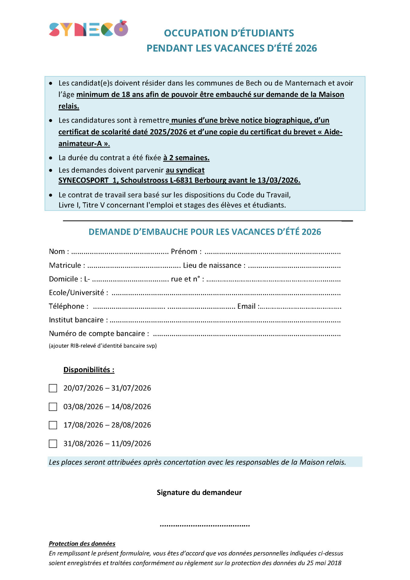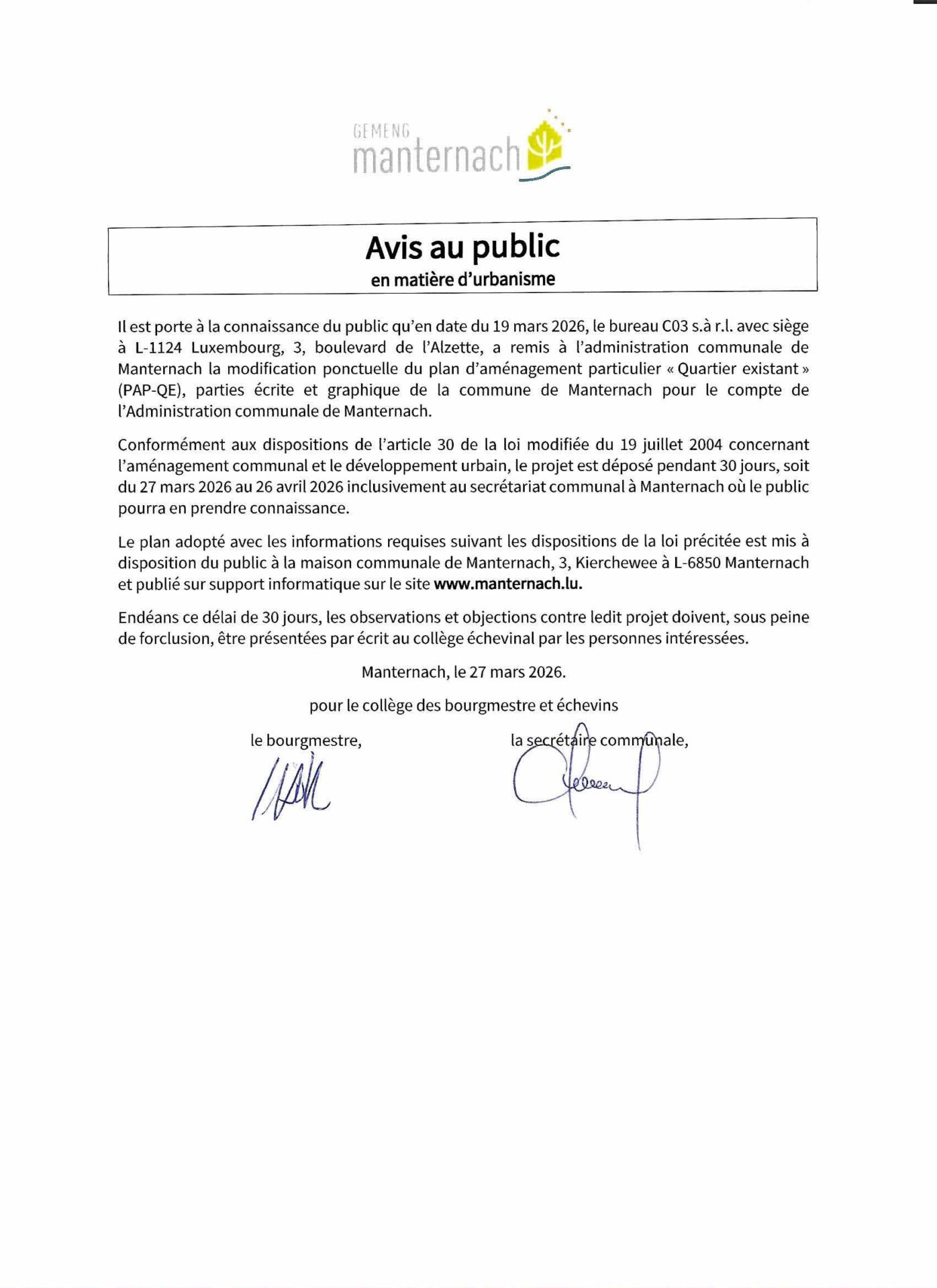 Les personnes intéressées, dont le profil répond aux exigences mentionnées ci-dessus doivent adresser leur candidature, par écrit, au collège des bourgmestre et échevins de la commune de Manternach, 3, Kierchewee, L-6850 Manternach jusqu’au 25 février 2026 inclus.