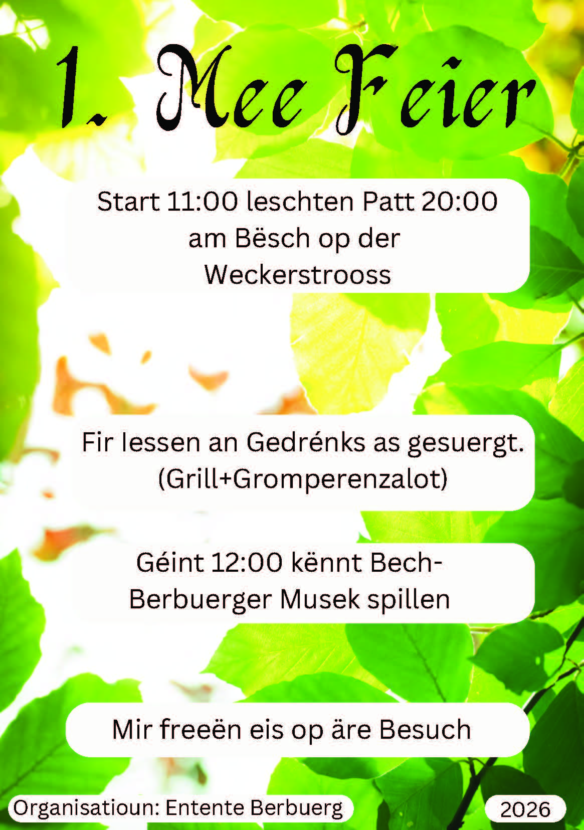 Freideg, den 1. Mee 2026 am Bësch op der Weckerstrooss! 🌿🎉