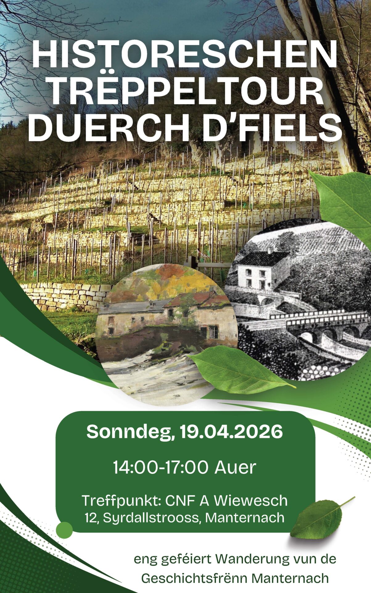 E Sonndeg, den 19. Abrëll 2026, entdeckt d’Geschicht vun eiser Gemeng op enger geféierter Wanderung!
