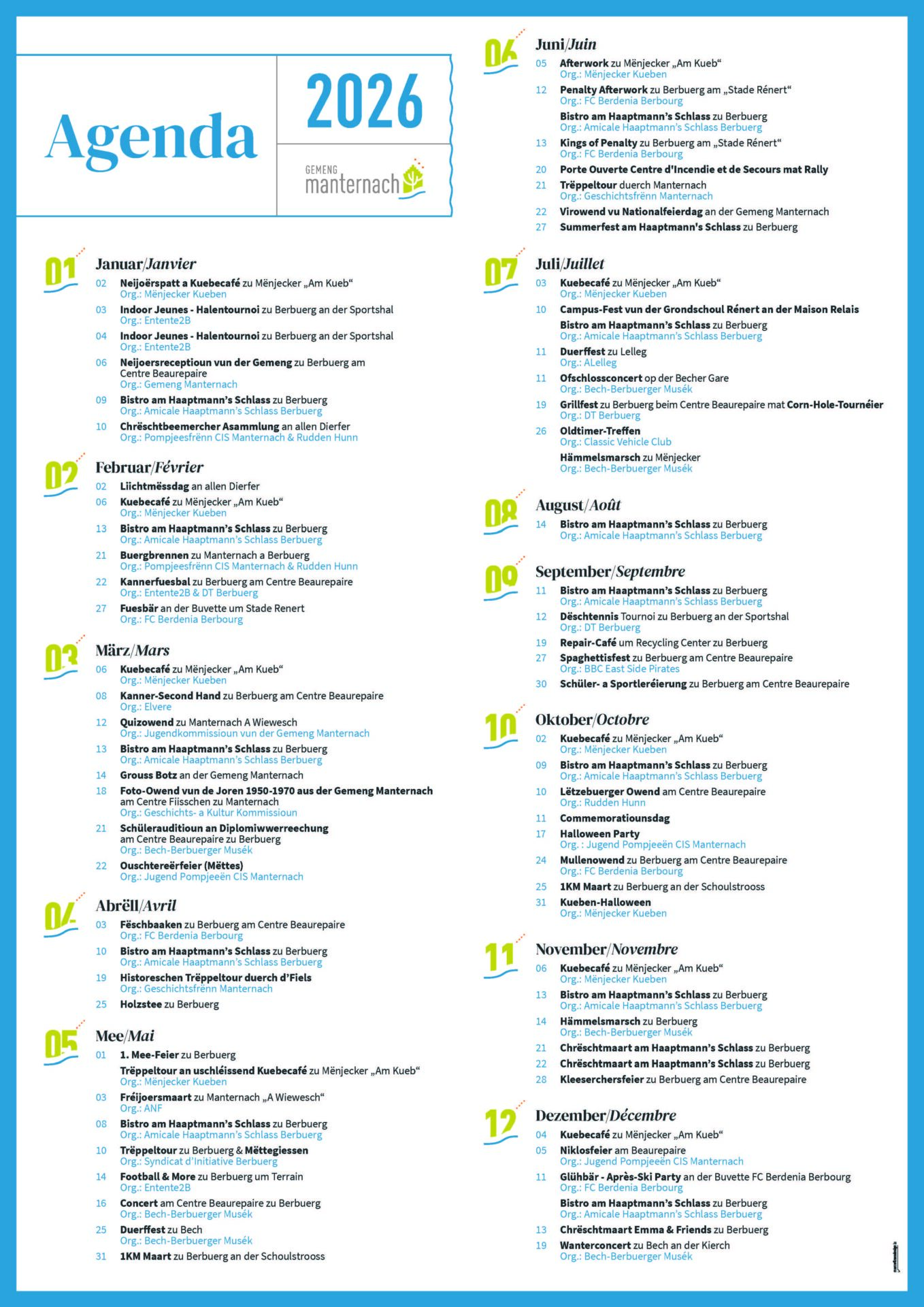 Fannt all déi néideg Informatiounen iwwer d’Manifestatiounen an der Gemeng an eisem Agenda. [klick]